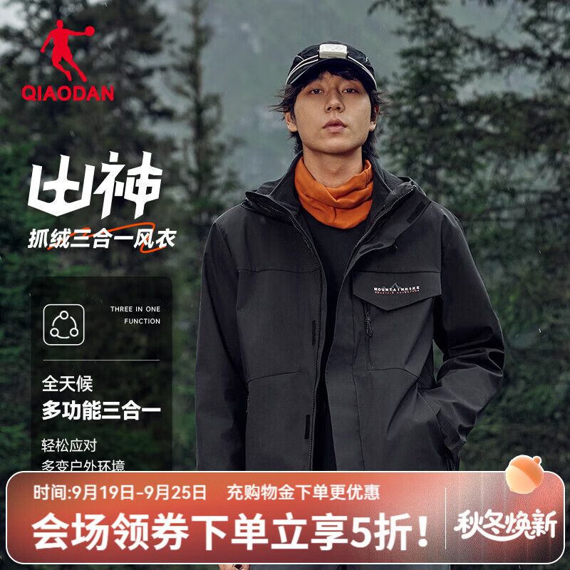 旗舰店乔丹【真5折】山神三合一外套男风衣冬季保暖防风加绒运动户外夹克 黑色 L