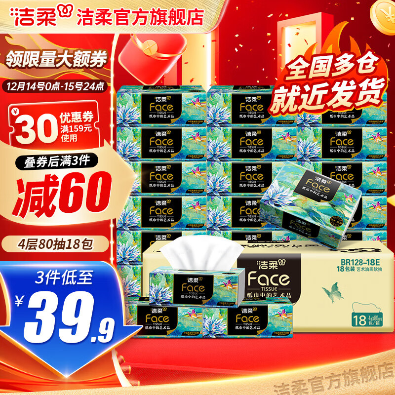 旗舰店洁柔Face艺术油画纸巾抽纸4层80抽18包整箱可湿水面巾纸卫生餐巾纸抽 4层 80抽*18包
