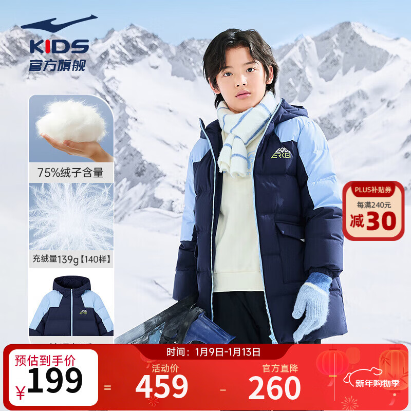 旗舰店鸿星尔克童装儿童羽绒服中长款男女童三防高蓬鸭绒保暖外套马年新年拜年服 蓝黑色-绒子含量75% 160 充绒量175g