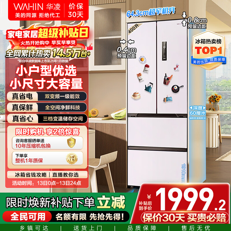 自营华凌美的出品400L法式多门60cm超薄零嵌入一级能效双变频净味风冷无霜家用电冰箱HR-419WUFPZ国家补贴