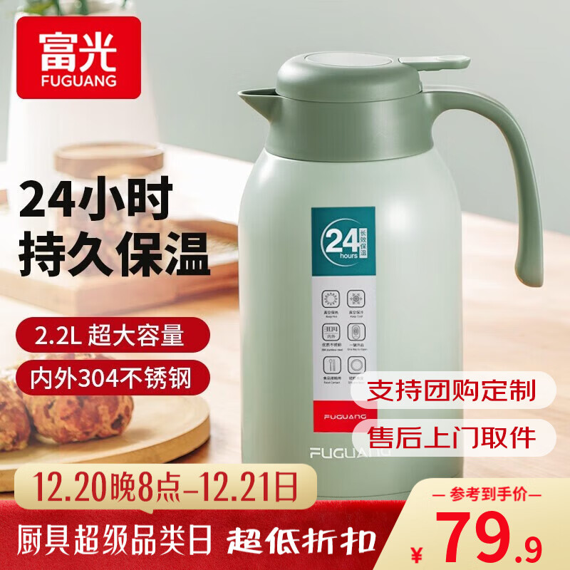 旗舰店富光 保温壶家用热水瓶开水瓶大容量不锈钢保冷壶家用保温咖啡杯壶 薄荷绿 2200ml