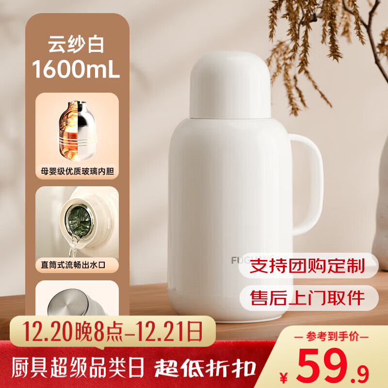 旗舰店富光保温壶大容量保温水壶家用宿舍热水壶学生热水瓶办公室暖水壶 云纱白 1600mL 【48小时保温-母婴级玻璃内