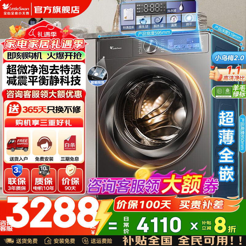 旗舰店小天鹅(LittleSwan)滚筒洗衣机全自动国家补贴小乌梅3.0/2.0 新品水魔方10/12公斤大容量单洗/洗烘一体机 以旧换新 【小乌梅2.0带烘干S83】低温柔烘+智能投放