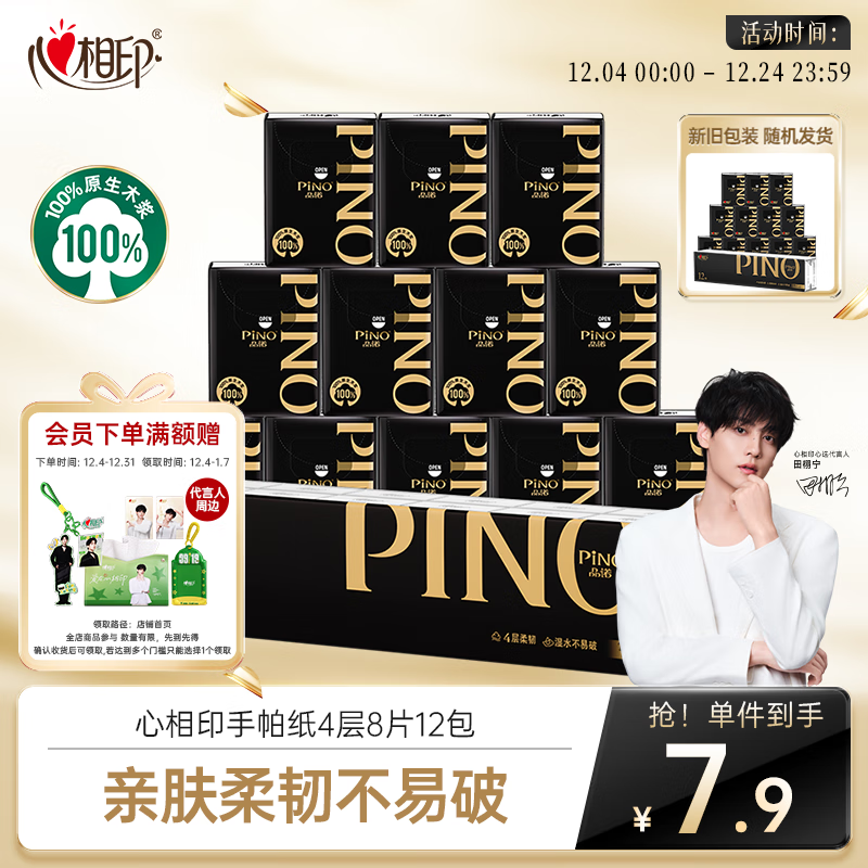 自营心相印【田栩宁同款】手帕纸品诺 4层8片*12包加厚便携纸巾黑色密码香氛