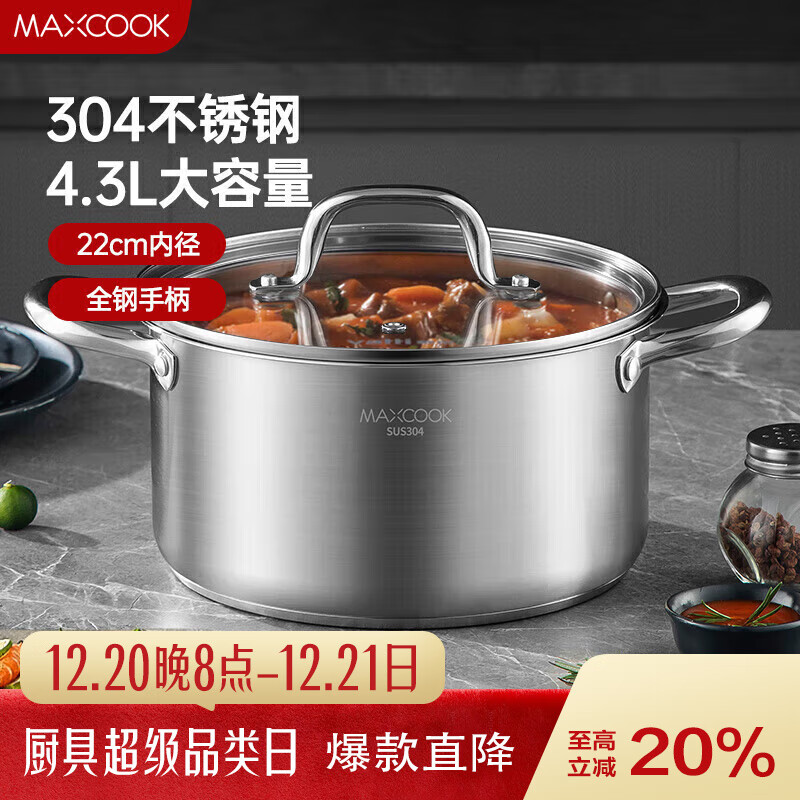 自营美厨(MAXCOOK)汤锅 304不锈钢汤锅汤煲22cm 加厚复合底 电磁炉通用MCT8237
