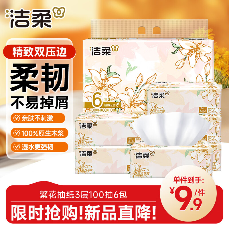 自营洁柔繁花抽纸 柔韧纸巾3层100抽*6包 面巾纸 湿水不易破