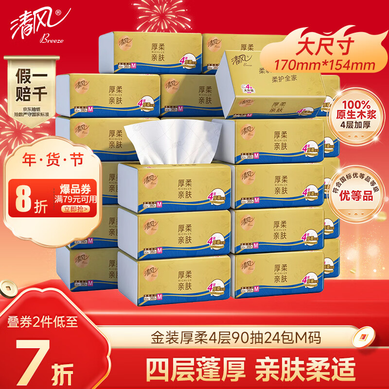 自营清风抽纸金装厚柔 360张*24包M码 4层纸巾抽 面巾纸餐巾纸 整箱装