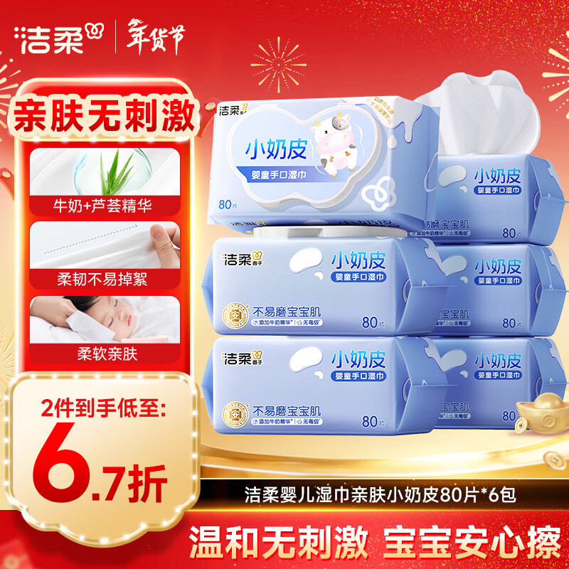 【下拉享优惠】洁柔婴儿湿巾小奶皮80片6包母婴娇嫩肌可用实惠装