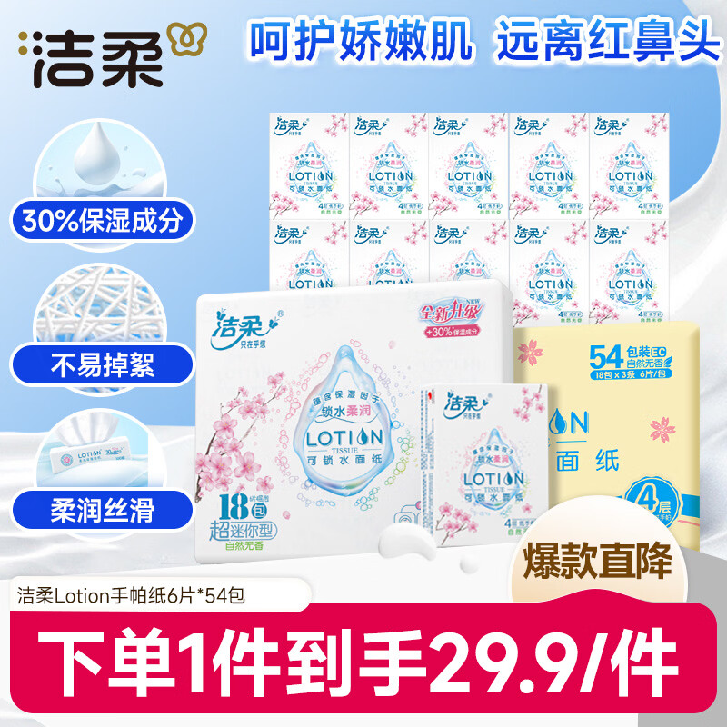 自营洁柔手帕纸Lotion4层6片*54包纸巾小包樱花系列保湿精华母婴可用
