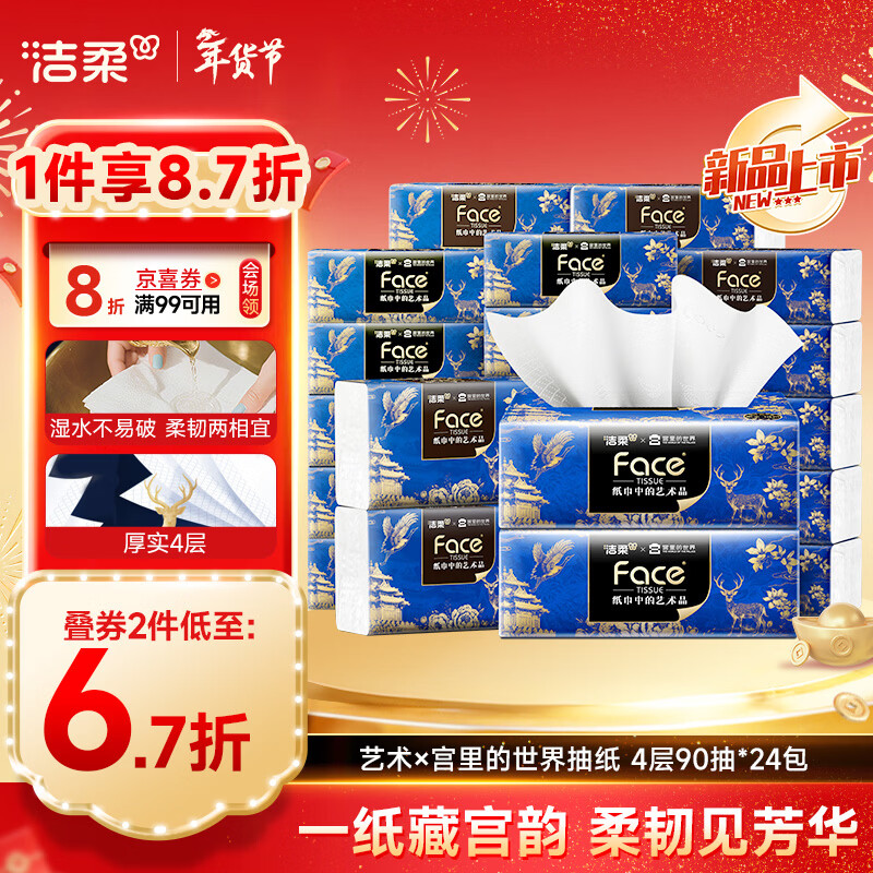 自营洁柔抽纸 艺术油画×宫里的世界 4层90抽*24包 M码 整箱纸巾 热门商品