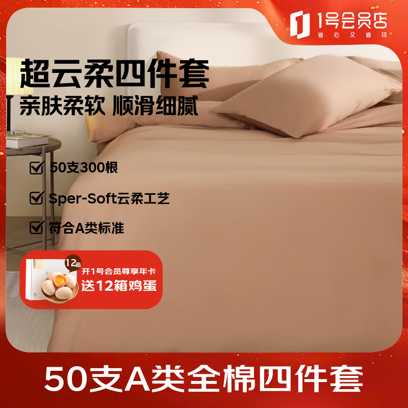 1号会员店50支A类纯棉新疆长绒棉床单被套床上四件套 床笠款 1.5米奶油咖
