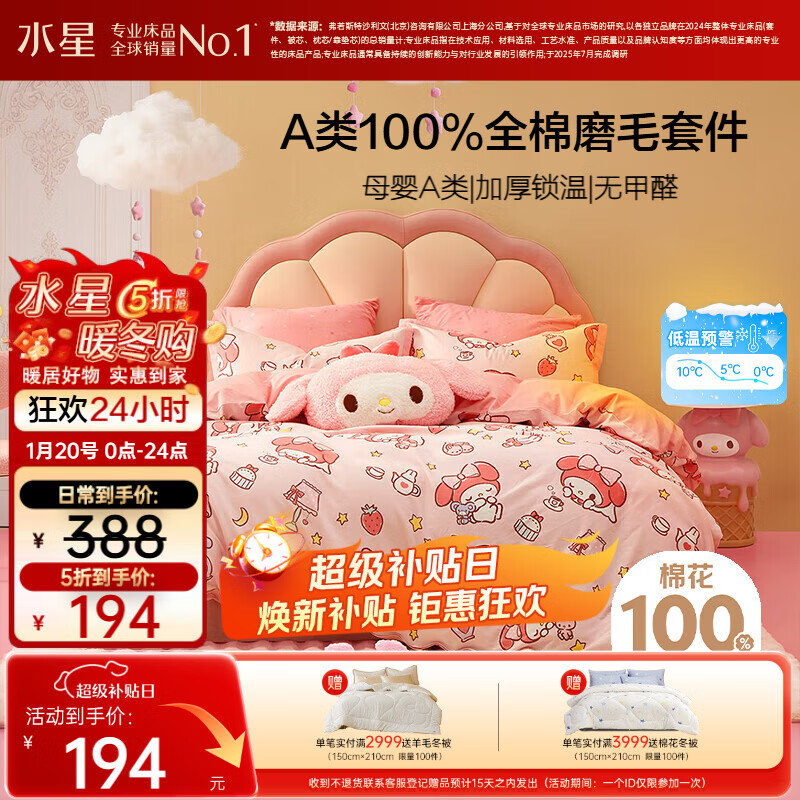 自营水星家纺磨毛四件套纯棉100%a类全棉床上用品床单被套冬季保暖双人1.8m床三丽鸥美乐蒂