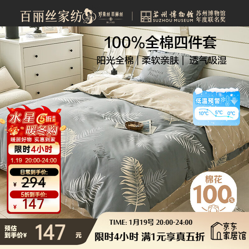 自营百丽丝水星家纺出品床上四件套纯棉100%全棉四件套被套床单双人床品套件1.8m床