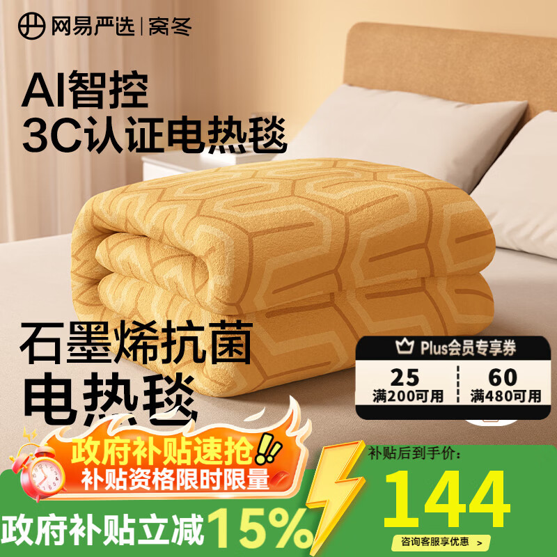 旗舰店网易严选 电热毯抗菌双人电褥子双温双控除螨除湿自动断电家用电暖毯子 石墨烯电热毯【9档AI智控款】暖橙色 180cm*80cm