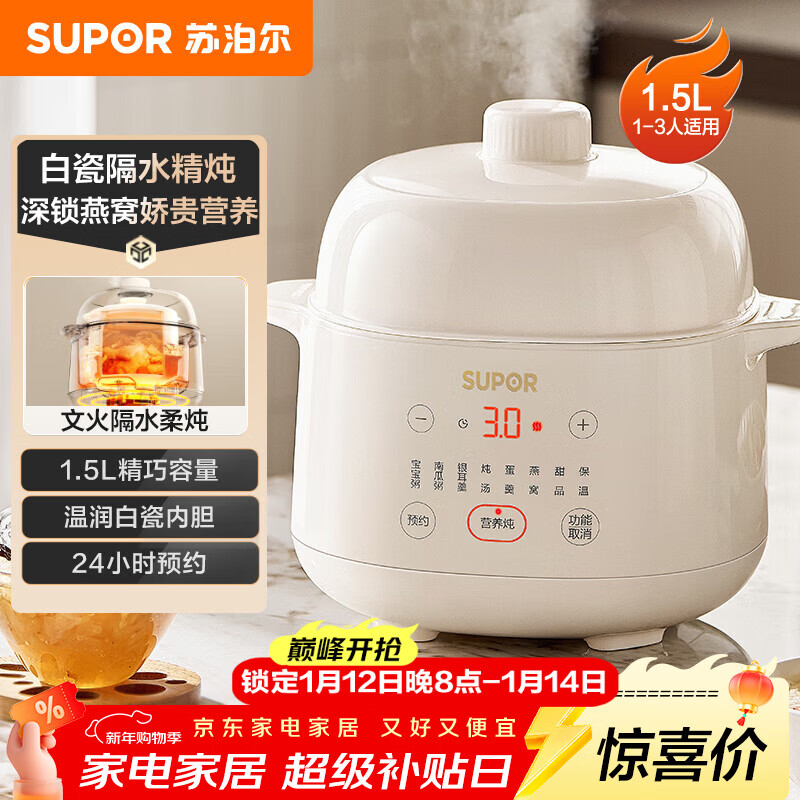 自营苏泊尔(SUPOR) 电炖锅 电炖盅 燕窝炖 宝宝辅食 婴儿煮粥锅1.5L精巧容量 隔水揉炖 bb煲迷你煮粥煲汤锅DZ15YC897