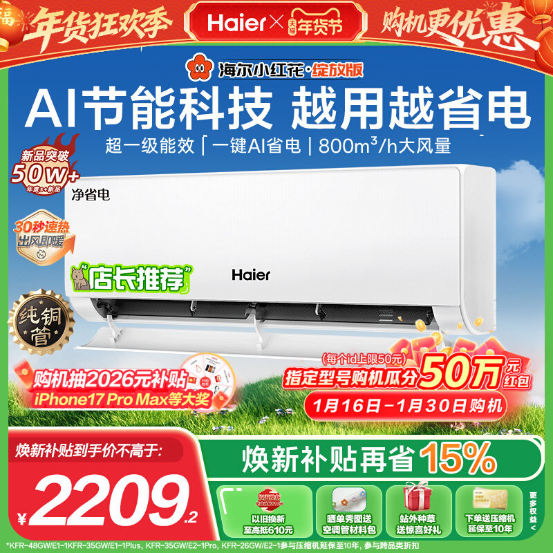 旗舰店[纯铜管]海尔小红花空调净省电新一级能效1.5匹变频冷暖挂机35E1