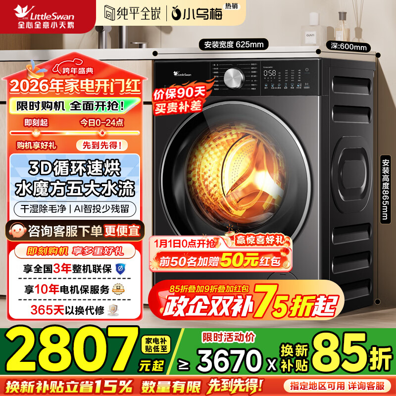 百亿补贴小天鹅(LittleSwan)滚筒洗衣机全自动10公斤 【小乌梅3.0】超薄全嵌 大容量 超微净泡 高洗净比国家补贴20% TG10VE40【小乌梅3.0标准版】超薄全嵌 单洗