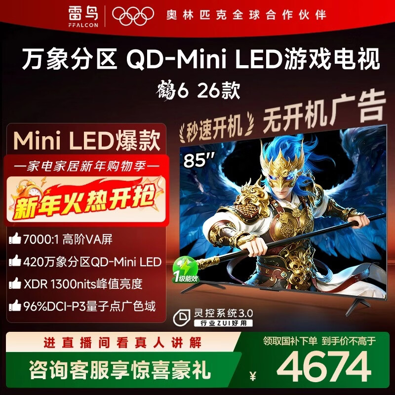 旗舰店FFALCON雷鸟电视鹤6 26款 85英寸 万象分区QD-MiniLED 1300nits 高阶VA 安桥音响288Hz高刷 85英寸 平板电视