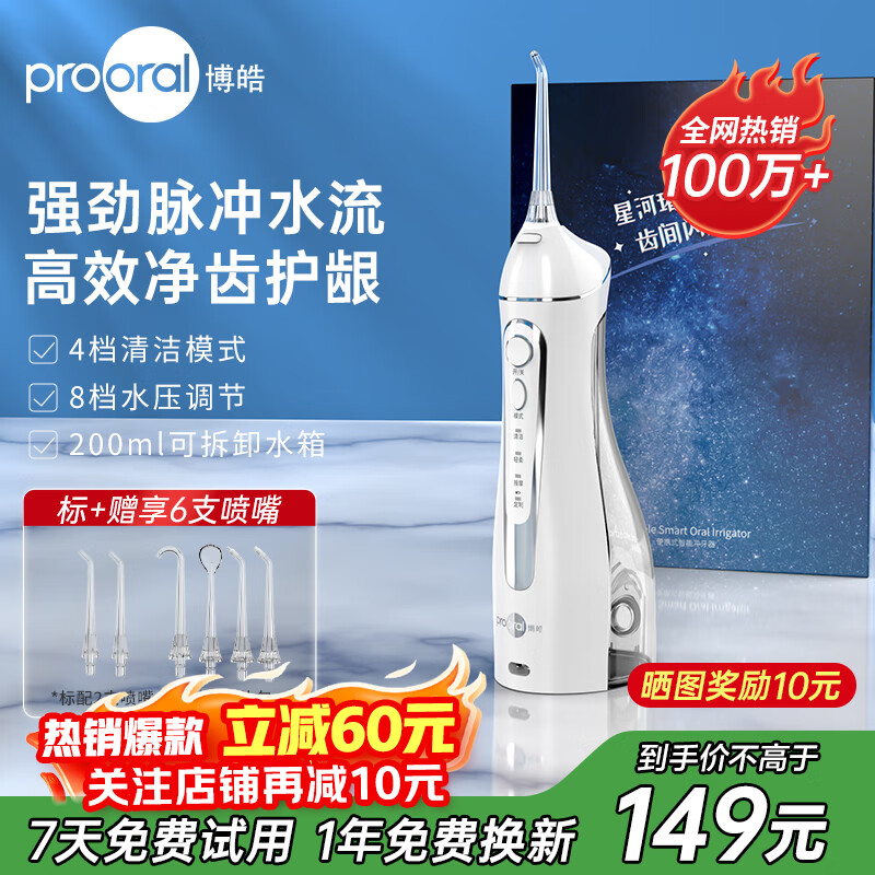 旗舰店博皓(prooral)电动冲牙器家用洗牙冲水器清理牙齿冲洗器水牙线洁牙机牙缝深度清洁牙垢去除工具牙套清洗正畸呵护 白色【升级版】
