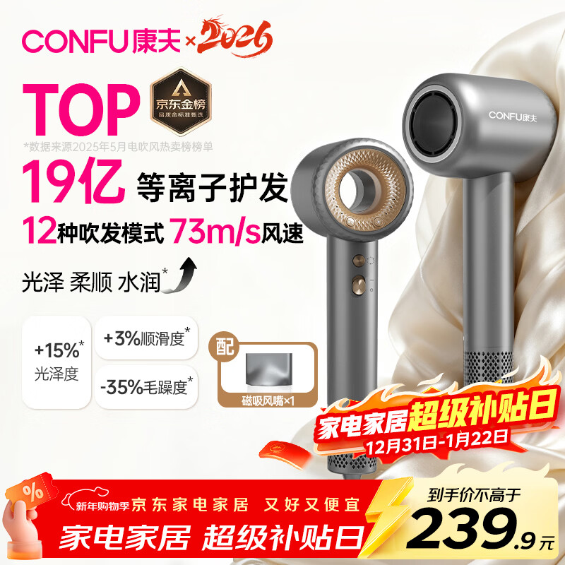 自营康夫(CONFU)高速护发吹风机中空无叶家用大功率大风力速干等离子电吹风筒生日礼物 新年礼物送女友F9星灰