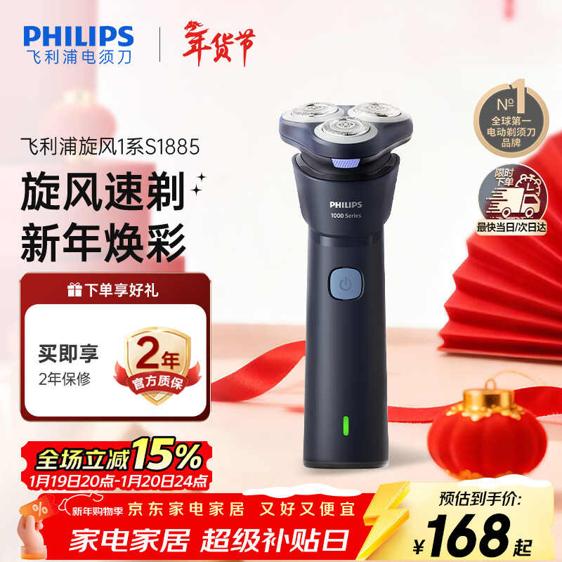 自营飞利浦(PHILIPS)电动剃须刀新一代旋风1系刮胡刀 风驰切剃3D浮动刀头 生日礼物送男生男友老公父亲