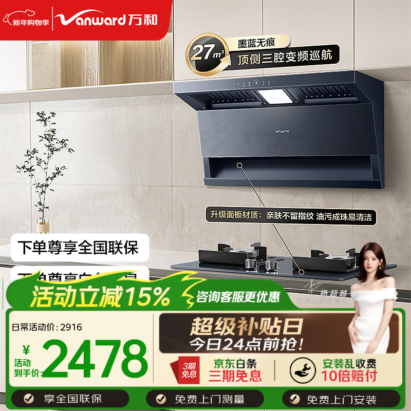 自营万和【小双翼V6L Pro·超薄不改柜】顶侧双吸抽排27风量大吸力变频搭燃气灶以旧换新油烟机