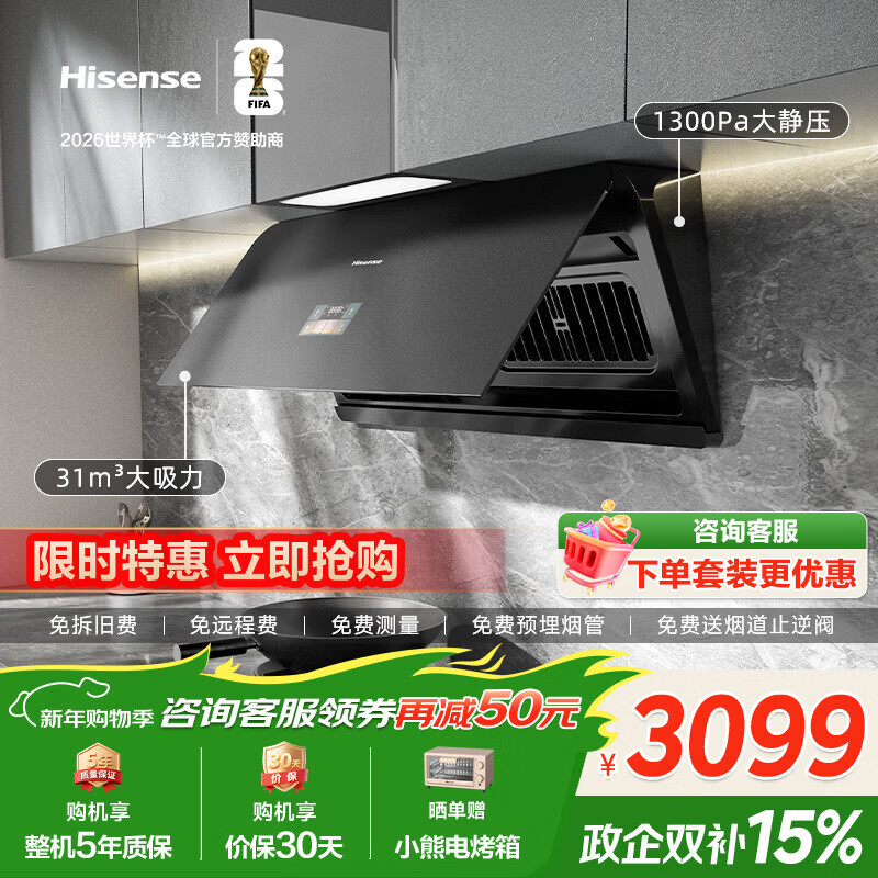 自营海信(Hisense)【超薄旗舰】易清洁31立方大吸力变频家用吸排抽油烟机S2Ultra+DB50天然气烟灶套装