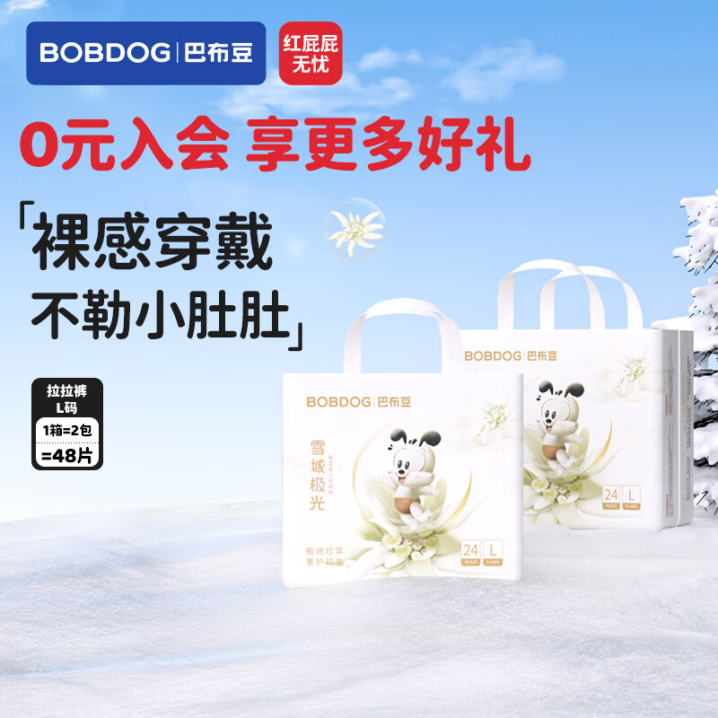 旗舰店巴布豆(BOBDOG)雪域极光拉拉裤超薄透气尿不湿纸尿裤试用夜用极地珍萃奢护新生 拉拉裤 L48片【17-23斤】