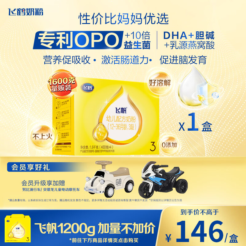 自营飞鹤飞帆OPO促吸收幼儿配方奶粉3段(12-36月龄)1600克 DHA好脑力