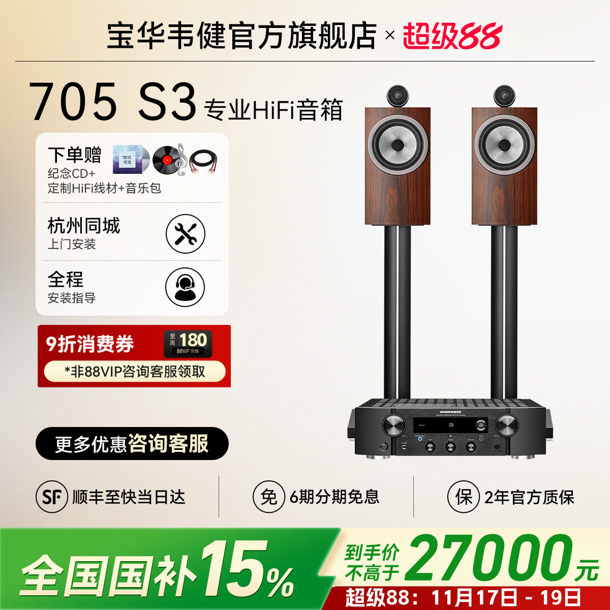 旗舰店【全国补贴15%】B&W宝华韦健705 S3家用音响发烧级书架式HIFI音箱