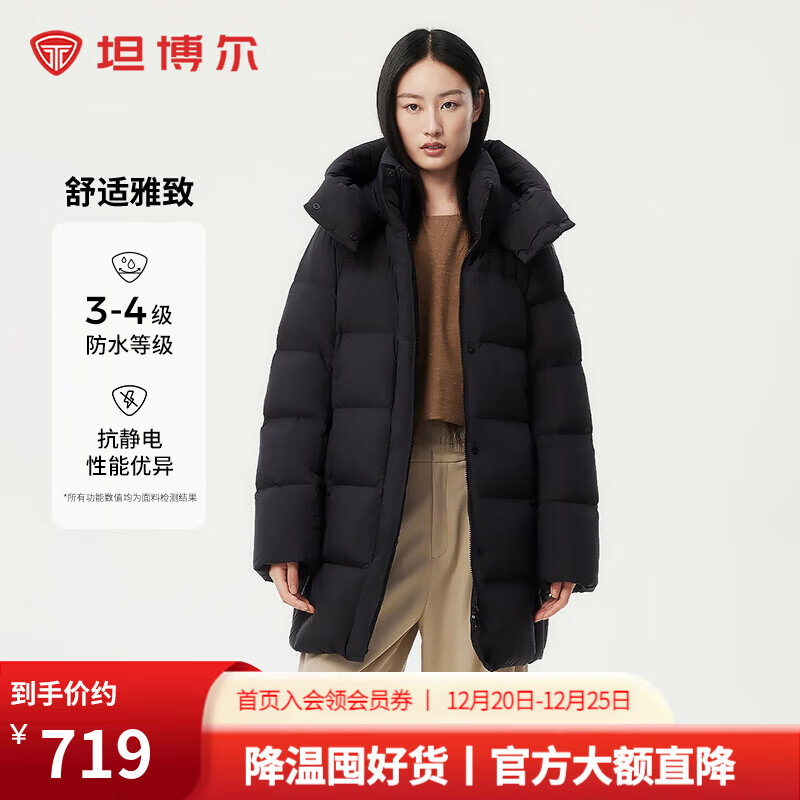旗舰店坦博尔2024冬季新款休闲百搭修身中长款脱卸帽保暖羽绒服女 黑色 3XL 185/104A