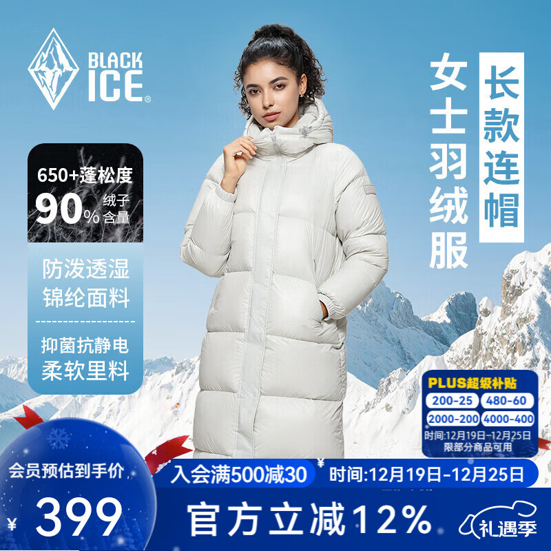 旗舰店黑冰【清仓】秋冬女过膝长款鸭绒连帽轻量保暖防风羽绒服外套 FAF8961 米白 L