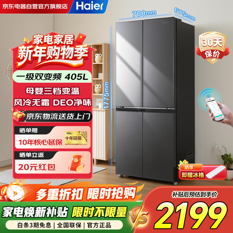 自营海尔(Haier)冰箱四开门405升家用一级能效双变频风冷无霜十字门大容量BCD-405WLHTDEDS9U1以旧换新
