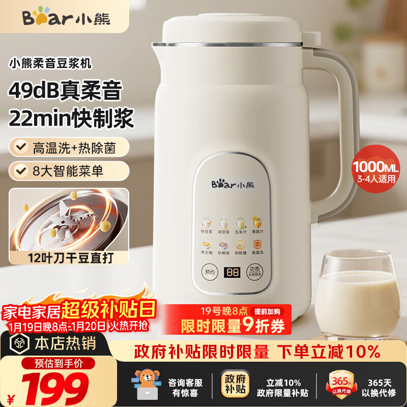 自营小熊(Bear)白月光豆浆机破壁机家用1L快豆浆大容量3-4人用全自动免煮2025新款多功能免过滤一键清洗DJJ-H08C1
