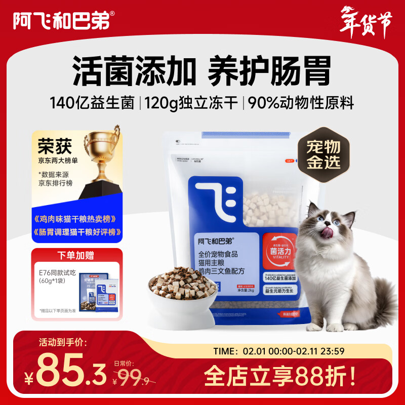 自营阿飞和巴弟猫粮E76益生菌全价冻干双拼全阶段通用猫粮鸡肉三文鱼 2kg