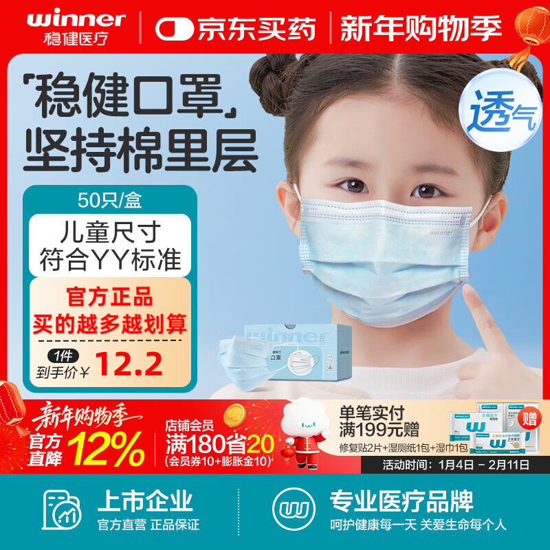旗舰店稳健医用外科口罩一次性医用口罩成人儿童透气防过敏防飞沫防尘棉里层 1盒儿童款蓝色(贵在运费,4盒装更划算) 50只/盒