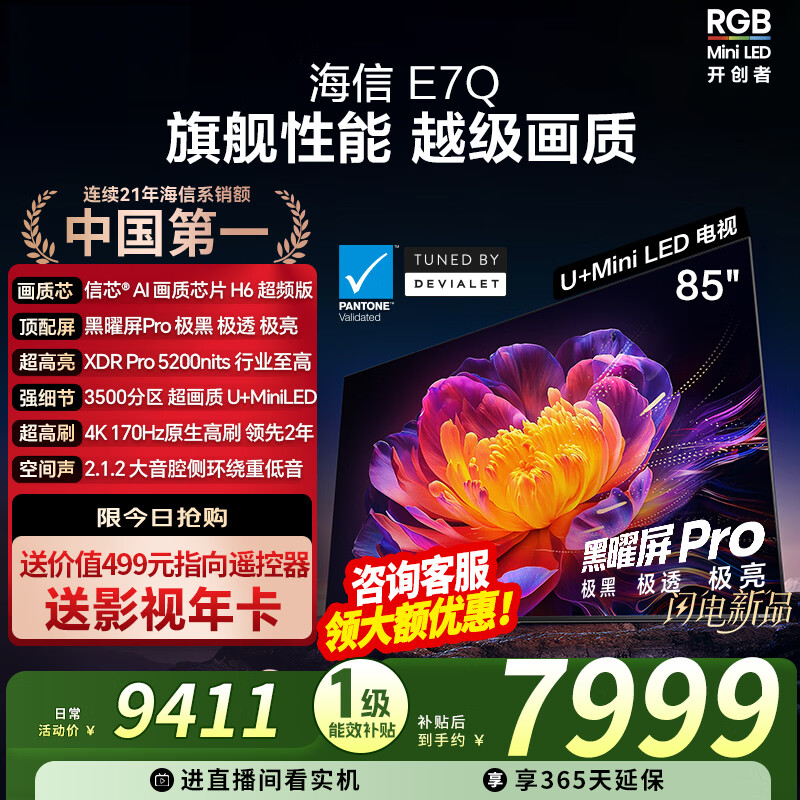 旗舰店海信电视E7Q 85英寸 信芯芯片H6超频版 黑曜屏Pro XDR5200nits 3500分区 300Hz e7npro升级 85英寸