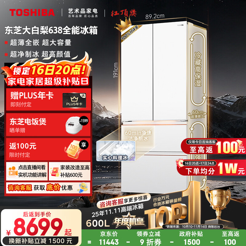 自营华凌美的出品400L法式多门60cm超薄零嵌入一级能效双变频净味风冷无霜家用电冰箱HR-419WUFPZ国家补贴