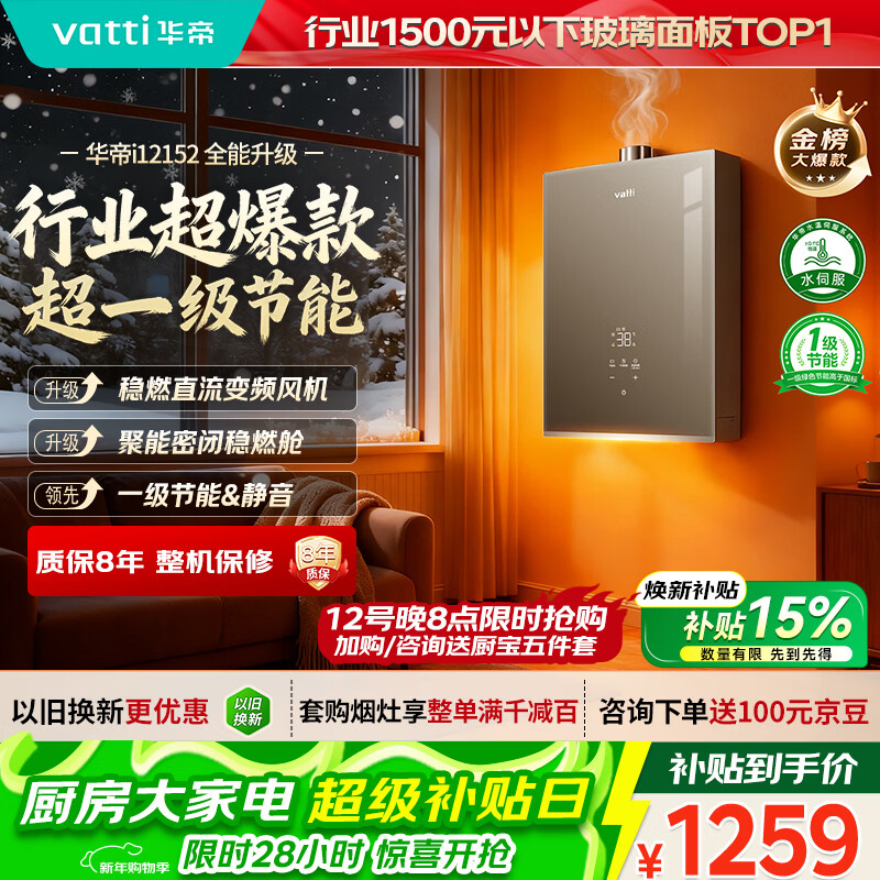 自营华帝(VATTI)【8A一级恒温+一级静音+一级节能】燃气热水器天然气家用水伺服玻璃屏小飞碟 i12152 16升上门安装