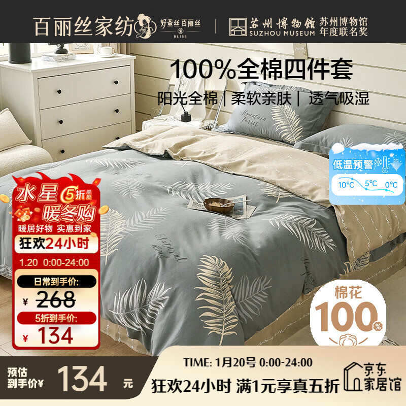 自营百丽丝水星家纺出品床上四件套纯棉100%全棉四件套床品被套床单套件1.5m床