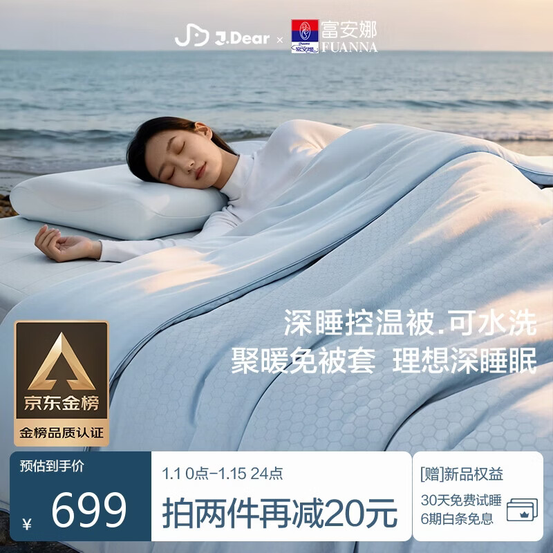 自营富安娜xJDear京东联名 深睡控温冬被 A类被子冬季免被套被芯 200x230cm