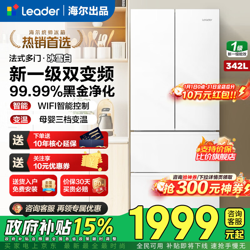 旗舰店海尔(Haier)冰箱342升双开门法式多门冰雪白新一级双变频三档变温黑金净化节能省电统帅leader小冰箱国家补贴 342升冰雪白+新一级能效+三档变温+黑金净化