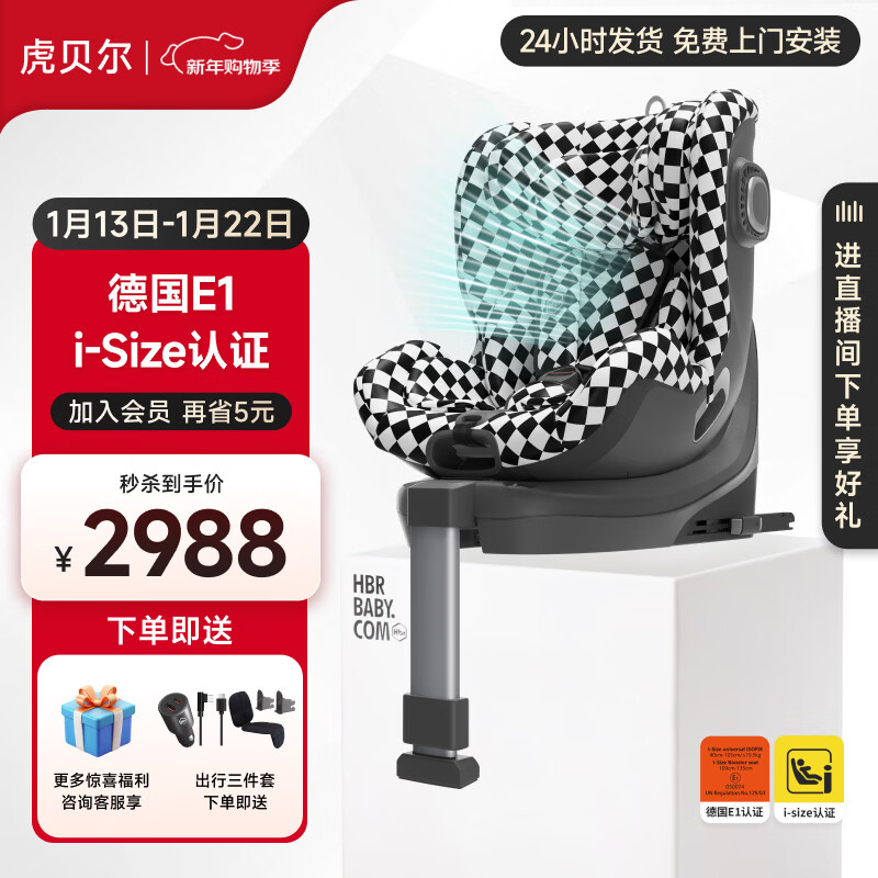 旗舰店虎贝尔E360儿童通风安全座椅0-12岁婴儿宝宝车载360度旋转E1认证 E360-黑白棋盘格【智能通风】
