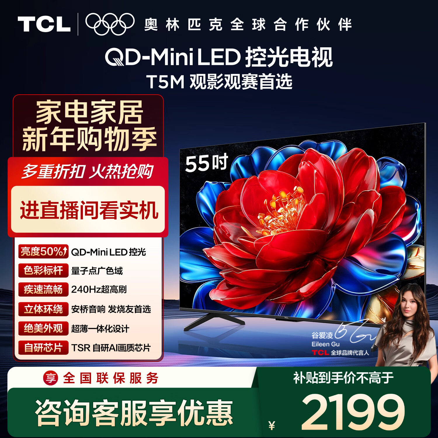 自营TCL电视 55T5M 55英寸 QD-Mini LED控光 240Hz高刷 QLED量子点 WiFi6 超薄 国家补贴20%