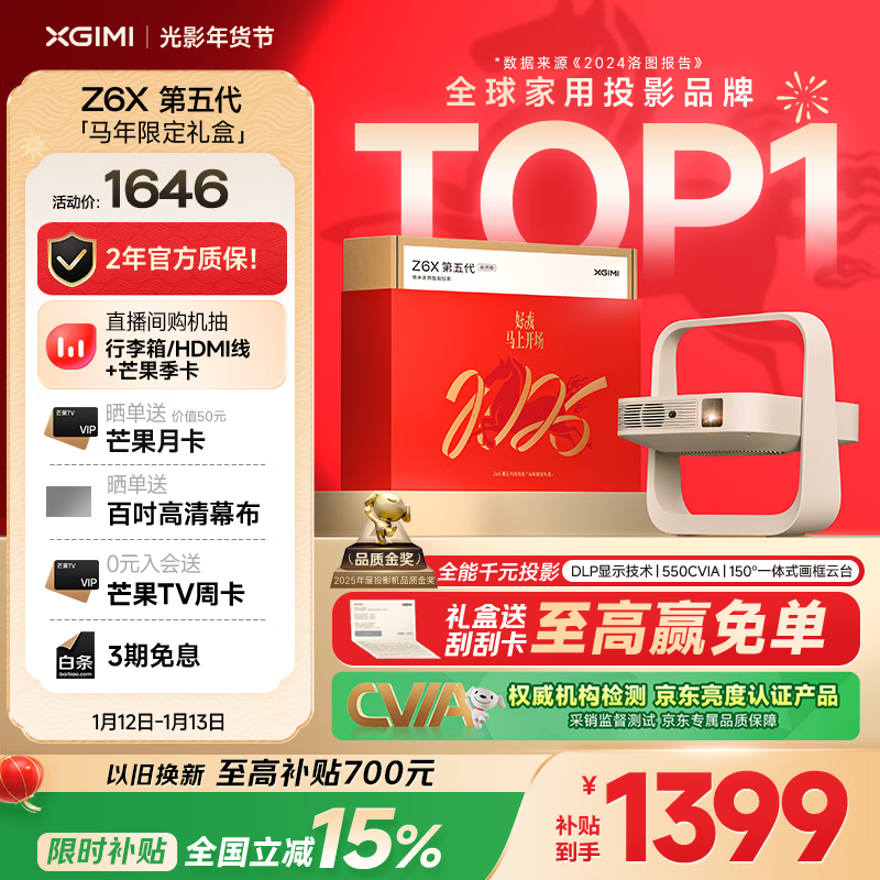 自营极米Z6X 第五代 高亮版 马年限定礼盒 投影仪家用 轻薄投影机高清 家庭影院 一体式云台 国家补贴