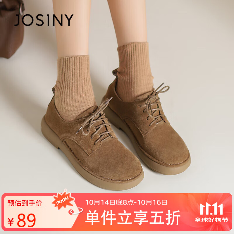 卓诗尼牛皮单鞋女春季棕色软底复古勃肯鞋系带百搭单鞋 灰绿色 37