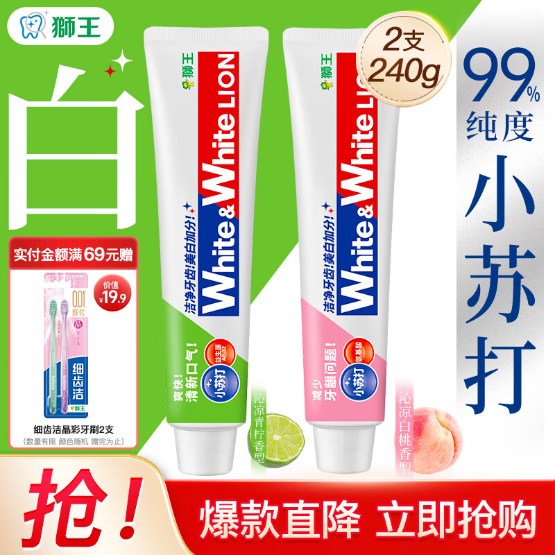 狮王(Lion)狮王大白葡萄柚小苏打牙膏氨基酸益生菌美白牙膏淡化牙渍亮白牙齿 氨基酸白桃120g+益生菌青柠120g