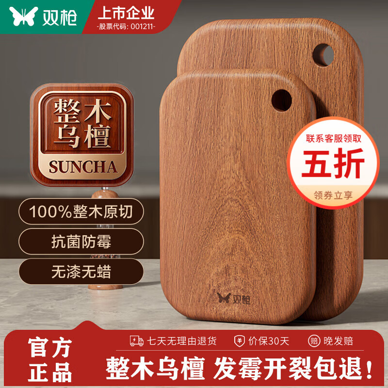 双枪(Suncha) 乌檀木整木菜板家用抗菌防霉小案板实木切菜板婴儿砧板辅食板 【适用2-3人】中号34*22*2.2cm(整木加厚)
