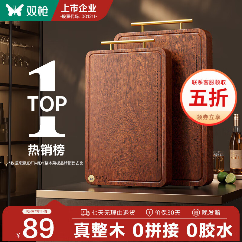 双枪乌檀木整木菜板实木抗菌防霉家用切菜板案板大号砧板 【金标抗菌-升级款】38*26*2.5