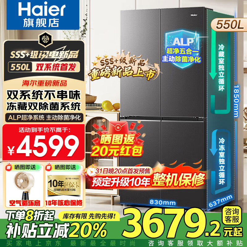 海尔(Haier)550升双系统冰箱【新品首发】十字四开门一级能效节能风冷无霜家用ALP超净系统大容量电冰箱 双系统双循环+ALP超净五效合一+新一级双变频